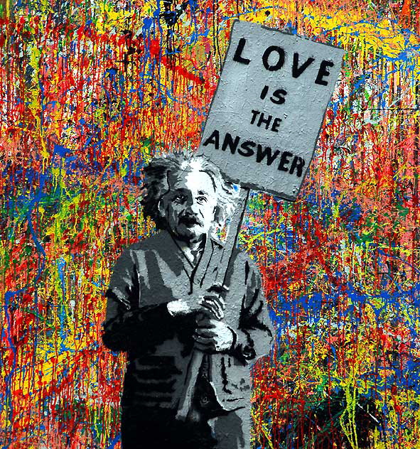 “Love is the answer” — Albert Einstein graphic on Jackson Pollock wall, La Brea, south of Hollywood; Retrieved from http://www.justabovesunset.com/200909/html/answers.html